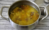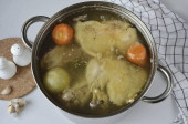 Wlać mięso czystą zimną wodą, tak aby było całkowicie pokryte wodą i jeszcze 2 palce (do gotowania) i doprowadzić do wrzenia. Gotować z lekkim, ledwo zauważalne wrzenia przez 5 godzin.