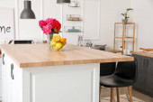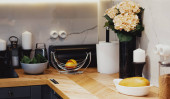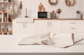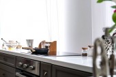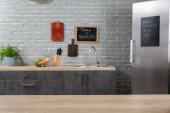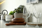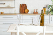 Puste kieliszki i butelka wina na blacie kuchennym przy ścianie z białej cegły