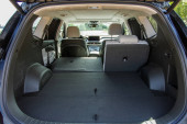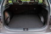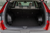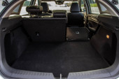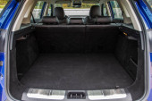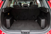 Ogromny, czysty i pusty bagażnik samochodowy we wnętrzu kompaktowego samochodu dostawczego. Widok z tyłu SUV-a z otwartym bagażnikiem