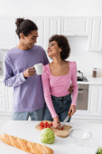 Młoda afrykańska para ze smartfonem i filiżanką patrząc na siebie w kuchni