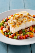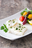 Grillowany dorsz z warzywami odizolowanymi na białym tle.
