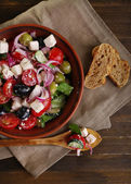 Miseczka sałatki greckiej serwowane w serwetkę na drewniane tło zbliżenie