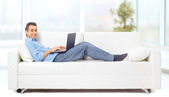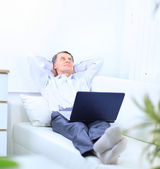 przedsiębiorcą z domu patrząc bardzo zrelaksowany w jego sofa przeglądania th