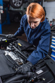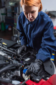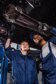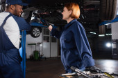 Mechanik w rękawiczkach patrzący na narzędzia w pobliżu zamazanego afrykańskiego kolegi i samochodu w służbie