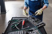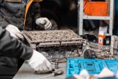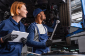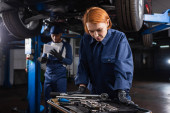 Mechanik w rękawiczkach przy rozmytym afrykańskim koledze w garażu