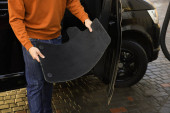 Brudne maty samochodowe wiszące w myjni samochodowej