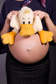 Kobieta w ciąży w koszula mężczyzny z kapcie dla dzieci na on