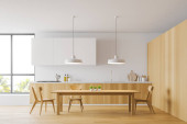 Aneks kuchenny z białym wzorem, przy użyciu metalowych lampek wiszących, drewnianego stołu jadalnego, okna nad zlewem i parkietem. Koncepcja nowoczesnego wnętrza domu. 3d renderowanie