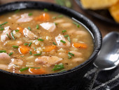 Zbliżenie miski kremowego kurczaka i zupy ryżowej ozdobione pietruszką na rustykalnym drewnianym stole