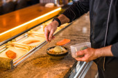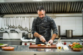 Zdjęcie "Profesjonalny kucharz przygotowuje posiłek w kuchni restauracji. On smaży mięso.." może być wykorzystywane do celów osobistych i komercyjnych zgodnie z warunkami zakupionej licencji Royalty-free. Obraz jest dostępny do pobrania w jakości wysokiej rozdzielczości do 5760x3840.