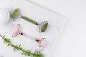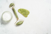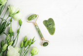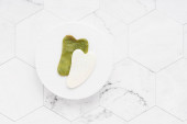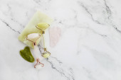 Narzędzia do masażu. Masażer Gua Sha, jadeitowe wałki do twarzy i gałąź eukaliptusa na marmurowym tle