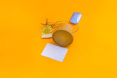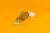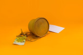 Rustykalny brązowy karton okrągły pudełko z pustą kartą podarunkową na pomarańczowym i różowym tle