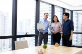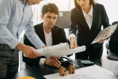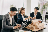 Zdjęcie "Kupić lub sprzedać koncepcję domu, przedstawiciel handlowy oferują umowę kupna domu kupić dom do męża i żony. Agenci sprzedaży domów obecnie oferuje projekty domów do klientów." może być wykorzystywane do celów osobistych i komercyjnych zgodnie z warunkami zakupionej licencji Royalty-free. Obraz jest dostępny do pobrania w jakości wysokiej rozdzielczości do 5760x3840.