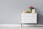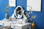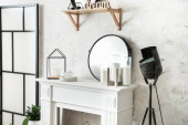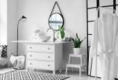 Wnętrze lekkiej łazienki z umywalką, lustrem i lampą stojącą