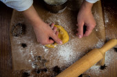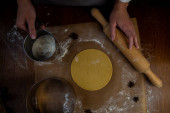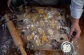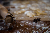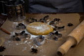Forma w kształcie choinki opiera się na wałku na tle ciasteczek, pergaminu i mąki wyciętych z ciasta. Zdjęcia w ciemnych kolorach.