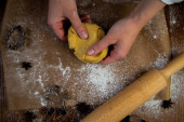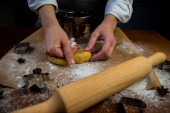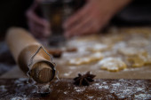 Zdjęcie "Forma w kształcie choinki opiera się na wałku na tle ciasteczek, pergaminu i mąki wyciętych z ciasta. Zdjęcia w ciemnych kolorach." może być wykorzystywane do celów osobistych i komercyjnych zgodnie z warunkami zakupionej licencji Royalty-free. Obraz jest dostępny do pobrania w jakości wysokiej rozdzielczości do 5760x3840.