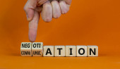 Sanction or negotiation symbol. Turned wooden cubes and changed the word sanction to negotiation. Beautiful orange table, orange background, copy space. Business, sanction or negotiation concept.