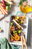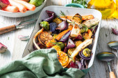 Pickled Tomatoes in Jar with Herbs. Healthy Preserved Food.