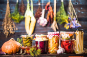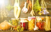 Homemade Preserves. PIckled Tomatoes. Conserve Food in Jar.