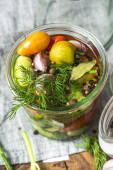 Fresh Vegetable Preserves in Jar. Pickled Tomato.