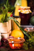 Homemade Preserves. PIckled Tomatoes. Conserve Food in Jar.
