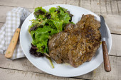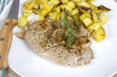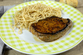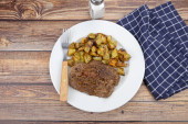 plasterek wątroby i placków ziemniaczanych na talerzu