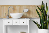 Zdjęcie "Stół z umywalką, gałąź roślin w wazonie i zaopatrzenie łaźni w pobliżu niebieskiej ściany" może być wykorzystywane do celów osobistych i komercyjnych zgodnie z warunkami zakupionej licencji Royalty-free. Obraz jest dostępny do pobrania w jakości wysokiej rozdzielczości do 5760x3840.