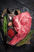 Świeże surowe mięso wołowe polędwica steki, zioła i przyprawy wokół deski do krojenia. Białe tło. Widok z góry