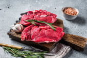 Zdjęcie "Świeże surowe mięso wołowe polędwica steki, zioła i przyprawy wokół deski do krojenia. Białe tło. Widok z góry" może być wykorzystywane do celów osobistych i komercyjnych zgodnie z warunkami zakupionej licencji Royalty-free. Obraz jest dostępny do pobrania w jakości wysokiej rozdzielczości do 5760x3840.