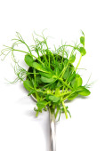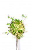 A heap of sprouted coriander seeds isolated on white. Coriander microgreens.