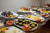 Various desserts in candy bar food buffet during hotel brunch. Self service in hotel restaurant