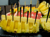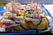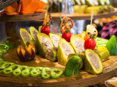 Various desserts in candy bar food buffet during hotel brunch. Self service in hotel restaurant