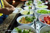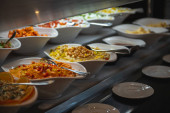 Restaurant with fresh and organic salads. Self-service food in a mall. Salad meals on counter top at buffet catering service