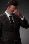 Sfrustrowany elegancki mężczyzna w średnim wieku Zamknij twarz zestresowanego biznesmena w stylowym garniturze z zamkniętymi oczami. Przepracowany biznesmen ze Środkowego Wschodu ze straszną migreną. Wysokiej jakości zdjęcie