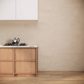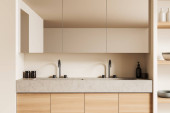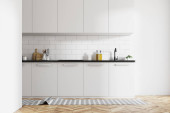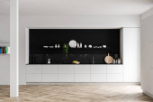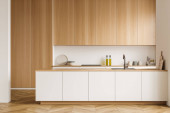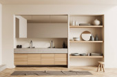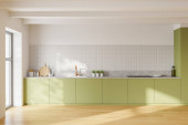 Zdjęcie "Skromne wnętrze kuchni z pustą ścianą, biało-zielonym wystrojem wnętrz, parkietem, dwiema otwartymi półkami i koncepcją nowoczesnego minimalistycznego stylu. 3d renderowanie" może być wykorzystywane do celów osobistych i komercyjnych zgodnie z warunkami zakupionej licencji Royalty-free. Obraz jest dostępny do pobrania w jakości wysokiej rozdzielczości do 5760x3840.