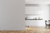 Skromne wnętrze kuchni z pustą ścianą, biało-zielonym wystrojem wnętrz, parkietem, dwiema otwartymi półkami i koncepcją nowoczesnego minimalistycznego stylu. 3d renderowanie