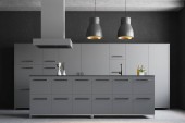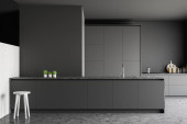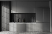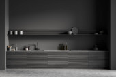Zdjęcie "Widok z bliska na ciemne wnętrze kuchni z szafą, kuchenką elektryczną, szarą ścianą, zlewem, mydłem w płynie, olejem i betonową podłogą. Koncepcja minimalistycznego designu. 3d renderowanie" może być wykorzystywane do celów osobistych i komercyjnych zgodnie z warunkami zakupionej licencji Royalty-free. Obraz jest dostępny do pobrania w jakości wysokiej rozdzielczości do 5760x3840.