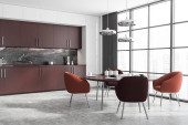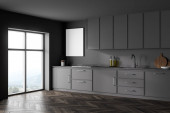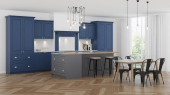 Zdjęcie "Szary i niebieski aneks kuchenny z drewnianym stołem jadalnym, oknem nad zlewem i parkietem. Pojęcie nowoczesnego wystroju wnętrz. 3d renderowanie" może być wykorzystywane do celów osobistych i komercyjnych zgodnie z warunkami zakupionej licencji Royalty-free. Obraz jest dostępny do pobrania w jakości wysokiej rozdzielczości do 5760x3840.