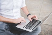 Piękny młody człowiek w niebieskiej koszulce, za pomocą laptopa, siedząc na parapecie w domu. Szczelnie-do góry