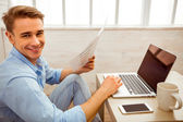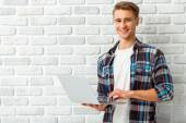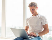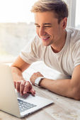 Pięknego młodzieńca w niebieska koszula i jeansy światła, używać laptopa przy stole, rozmawiając na smartphone, siedząc na podłodze w domu
