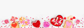 Valentines Day sweets double border with a variety of sweets. Overhead view on a white banner background with copy space.