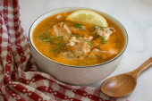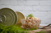 ryba w puszce w słoiku, koper na drewnianym tle