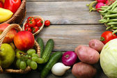 świeże organiczne warzywa i owoce na drewnianym tle