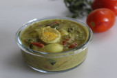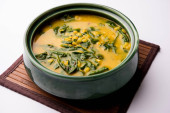 Lentil curry prepared with fresh fenugreek leaves, commonly called Methi dal in India. Shot with lentils and fresh fenugreek leaves around on a white background