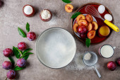 Ingredients for dough for plum cake on wooden table. Flat lay.