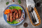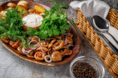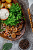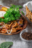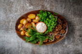 Serving a dish from a restaurant menu: country-style baked potatoes with pickled mushrooms and onions, cream sauce, dill and parsley greens on a plate against the background of a gray stone table