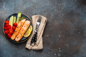 Vegetables healthy salad with red and yellow cherry tomatoes, pepper and green salad leafs on white rustic ceramic plate