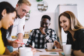 From above of multiethnic young coworkers in casual outfit sitting at table while listening to male colleague using tablet and papers with charts in modern kitchen interior