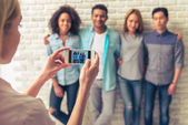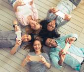 Widok z góry przystojnego młodego ojca robienia selfie z jego piękną rodziną, leżąc na drewnianej podłodze w domu.