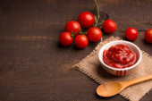 Zamknij ketchup i pomidory umieszczone na drewnianym tle. Łyżka ketchupu.